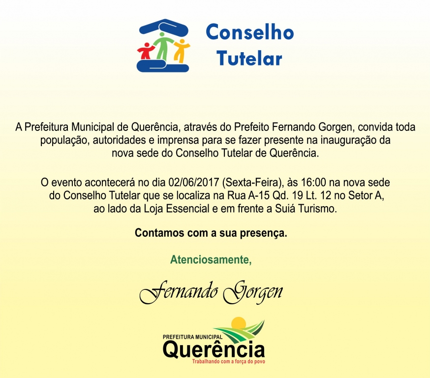 A Prefeitura Municipal de Querência, através do Prefeito Fernando Gorgen, convida toda população, autoridades e imprensa para se fazer presente na inauguração da nova sede do Conselho Tutelar de Querência.