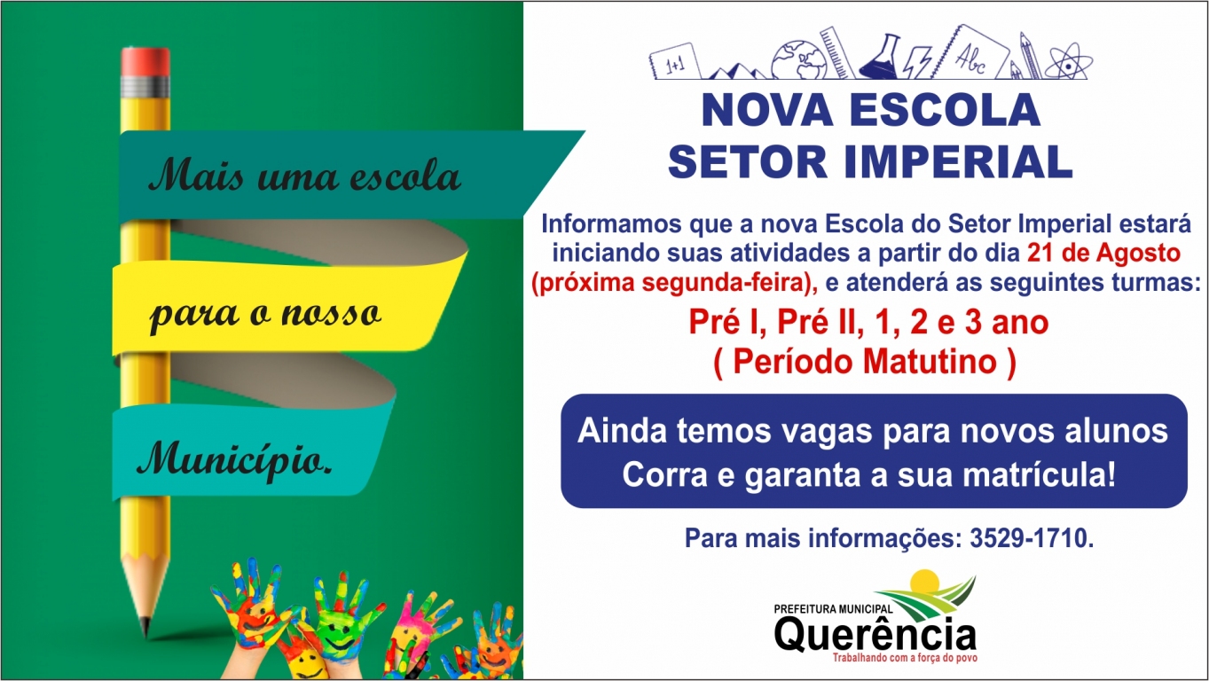 Informamos que a nova Escola do Setor Imperial estará iniciando suas atividades a partir do dia 21 de Agosto (próxima segunda-feira), e atenderá as seguintes turmas: Pré I, Pré II, 1, 2 e 3 ano (Período Matutino).