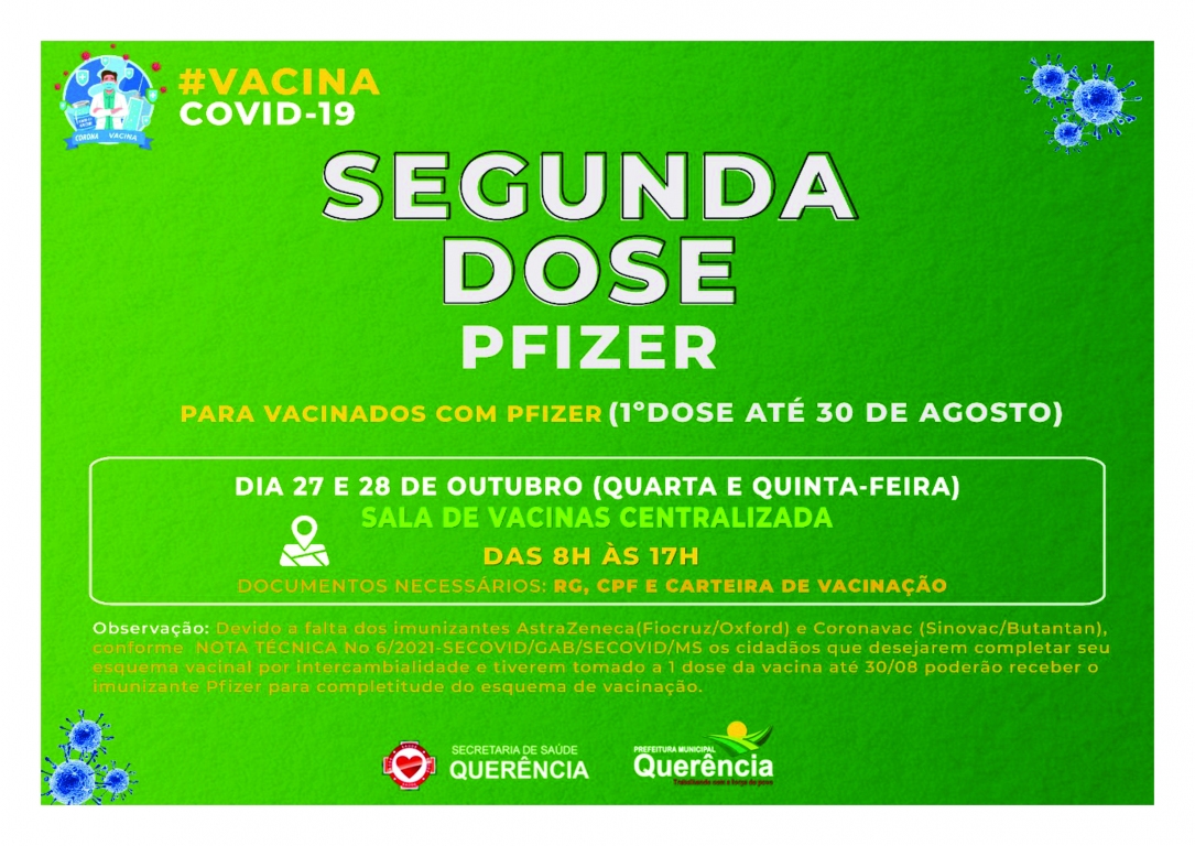 Observação: Devido a falta dos imunizantes AstraZeneca(Fiocruz/Oxford) e Coronavac (Sinovac/Butantan), conforme NOTA TÉCNICA Nº 6/2021-SECOVID/GAB/SECOVID/MS os cidadãos que desejarem completar seu esquema vacinal por intercambialidade e tiverem tomado a 1ª dose da vacina até 30/08 poderão receber o imunizante PFIZER para completitude do esquema de vacinação.