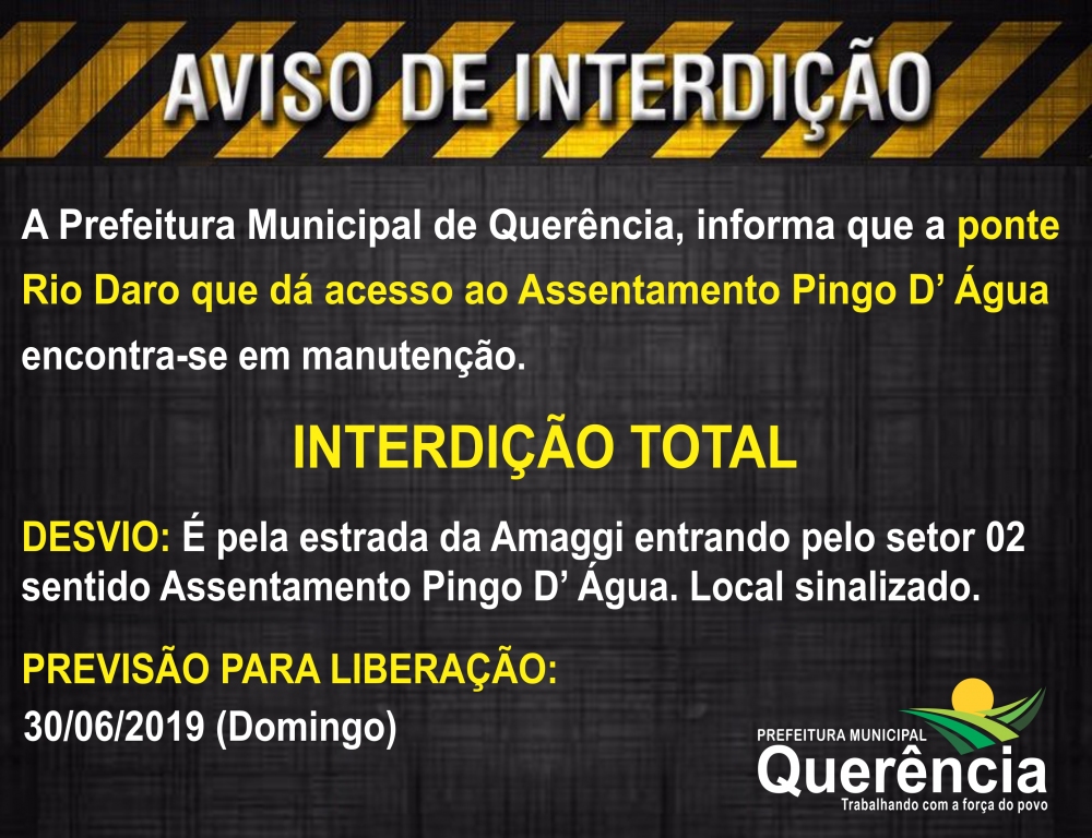 A Prefeitura Municipal de Querência, informa que a ponte Rio Daro que dá acesso ao Assentamento Pingo D’ Água encontra-se em manutenção.
