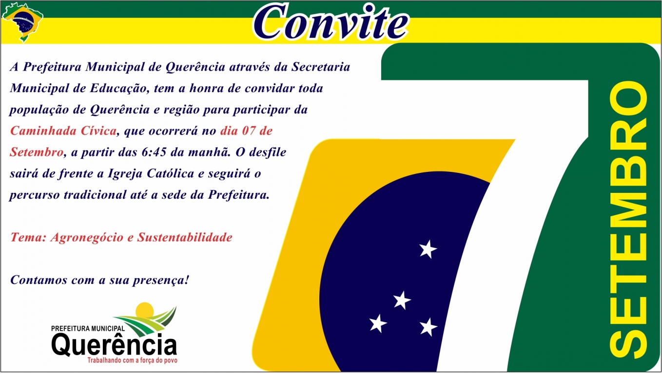 A Prefeitura Municipal de Querência através da Secretaria Municipal de Educação, tem a honra de convidar toda população de Querência e região para participar da Caminhada Cívica, que ocorrerá no dia 7 de setembro, a partir das 6:45 da manhã. O desfile sairá de frente a Igreja Católica e seguirá o percurso tradicional até a sede da Prefeitura.