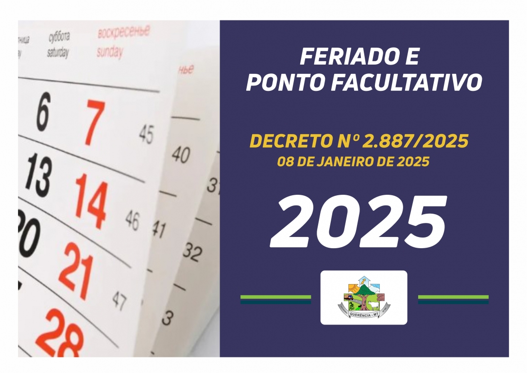 Divulga as datas dos feriados nacional, estadual, municipal e pontos facultativos nas repartições públicas do Município de Querência, Estado de Mato Grosso, do ano de 2025.