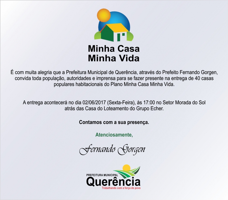 É com muita alegria que a Prefeitura Municipal de Querência, através do Prefeito Fernando Gorgen, convida toda população, autoridades e imprensa para se fazer presente na entrega de 40 casas populares habitacionais do Plano Minha Casa Minha Vida.