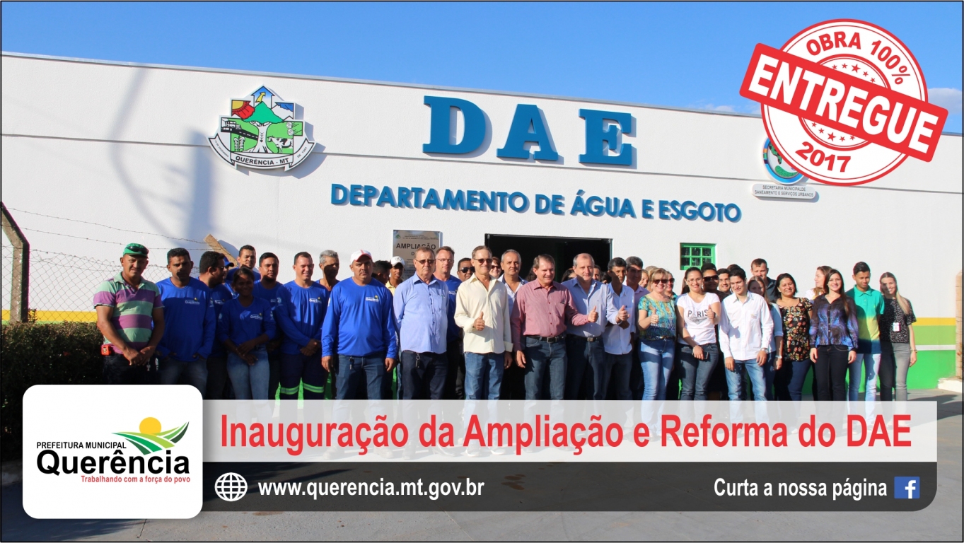 Foi realizado na manhã desta segunda-feira (24), a inauguração de mais uma grande obra para o nosso município. Na oportunidade foi inaugurada a nova estrutura ampliada e reformada do DAE (Departamento de Água e Esgoto). Com esse novo prédio proporcionaremos melhores condições de trabalho para os nossos colaboradores e uma melhor prestação de serviço para a população.