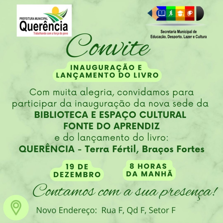 É com imensa alegria que convidamos você para a inauguração da nova sede da Biblioteca e Espaço Cultural Fonte do Aprendiz e o lançamento do livro: “Querência - Terra Fértil, Braços Fortes”