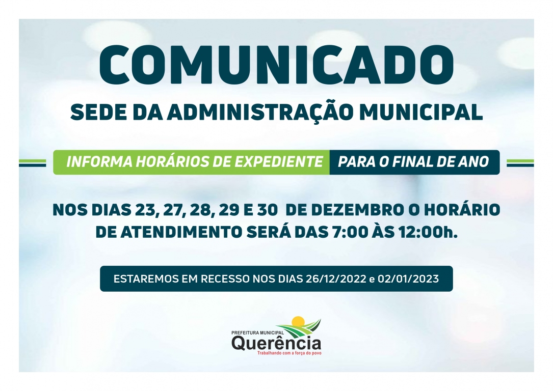 Nos dias 23, 27, 28, 29 e 30 de dezembro o horário de atendimento será das 07:00 às 12:00h.