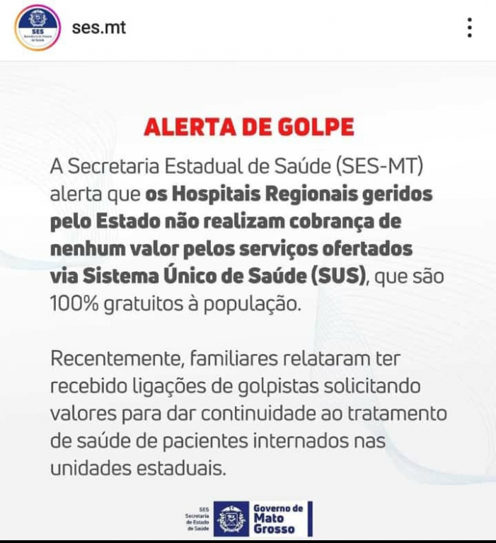 Contudo, esclarecemos a população em geral que todas as internações e exames realizados em pacientes internados são custeados pelo Sistema Único de Saúde (SUS), ficando evidenciando a tentativa de golpe.