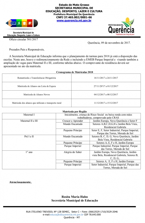 A Secretaria Municipal de Educação informa que o planejamento de turmas para 2018 já está a disposição das escolas. Neste ano, houve o redimencionamento da Rede e incluindo a EMEB Parque Imperial e visando também a ampliação de vagas para Maternal II e III, conforme tabelas abaixo. O comprovante de residência deverá ser apresentado no ato da matrícula.