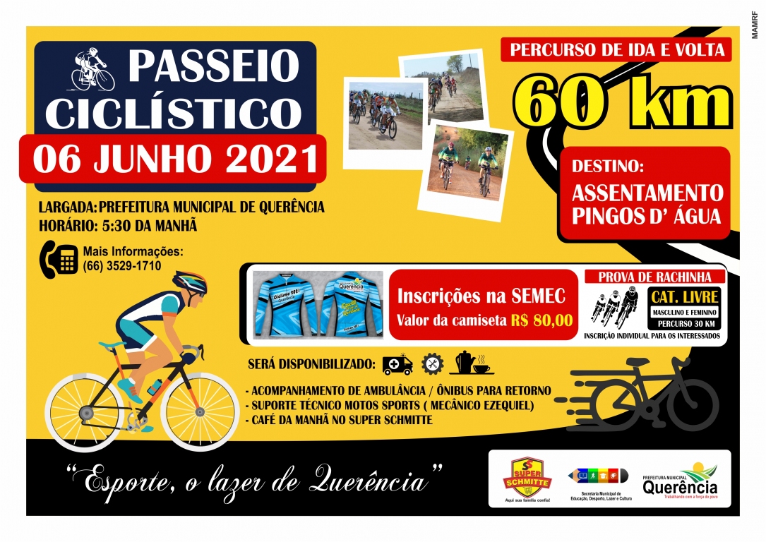 Com o objetivo de despertar o interesse da sociedade para a importância da atividade física, o Departamento de Esportes da Secretaria de Educação, Desporto. Lazer e Cultura irá realizar o Passeio Ciclístico.