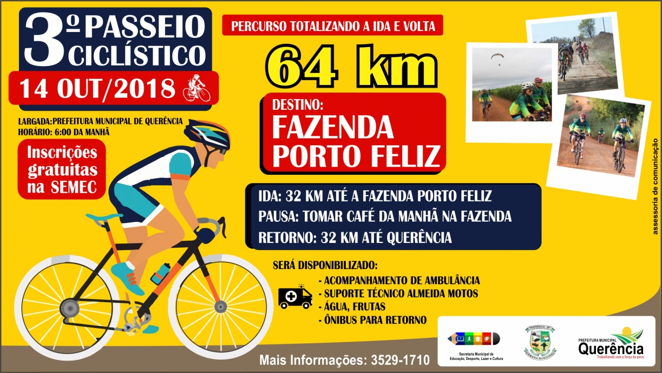 A Prefeitura Municipal de Querência, ð¤ através da Secretaria de Educação, Desporto, Lazer e Cultura, convida toda população para participar do ''Passeio Ciclístico''.